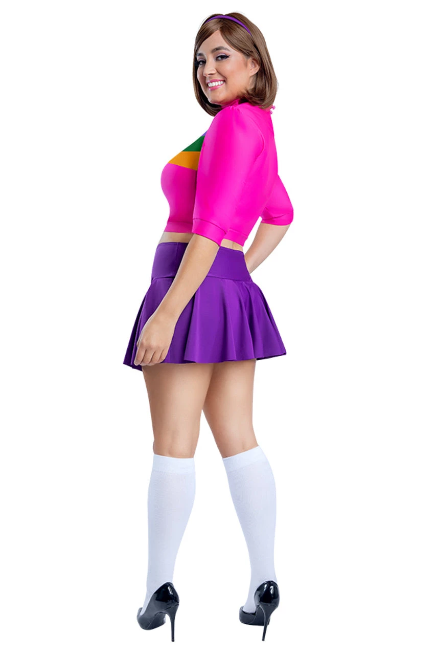 This plus size Sexy Mabel costume includes a pink spandex screen printed crop top, a matching purple skirted panty, headband, and socks.